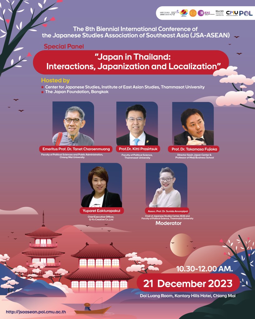 The Faculty of Political Science and Public Administration, Chiang Mai University, Thailand, will be the host of the 8th Japanese Studies Association – ASEAN (JSA-ASEAN) from 20th to 22nd December 2023 at Kantary Hills Hotel, Chiang Mai. Please visit this website for more information: http://jsaasean.pol.cmu.ac.th/